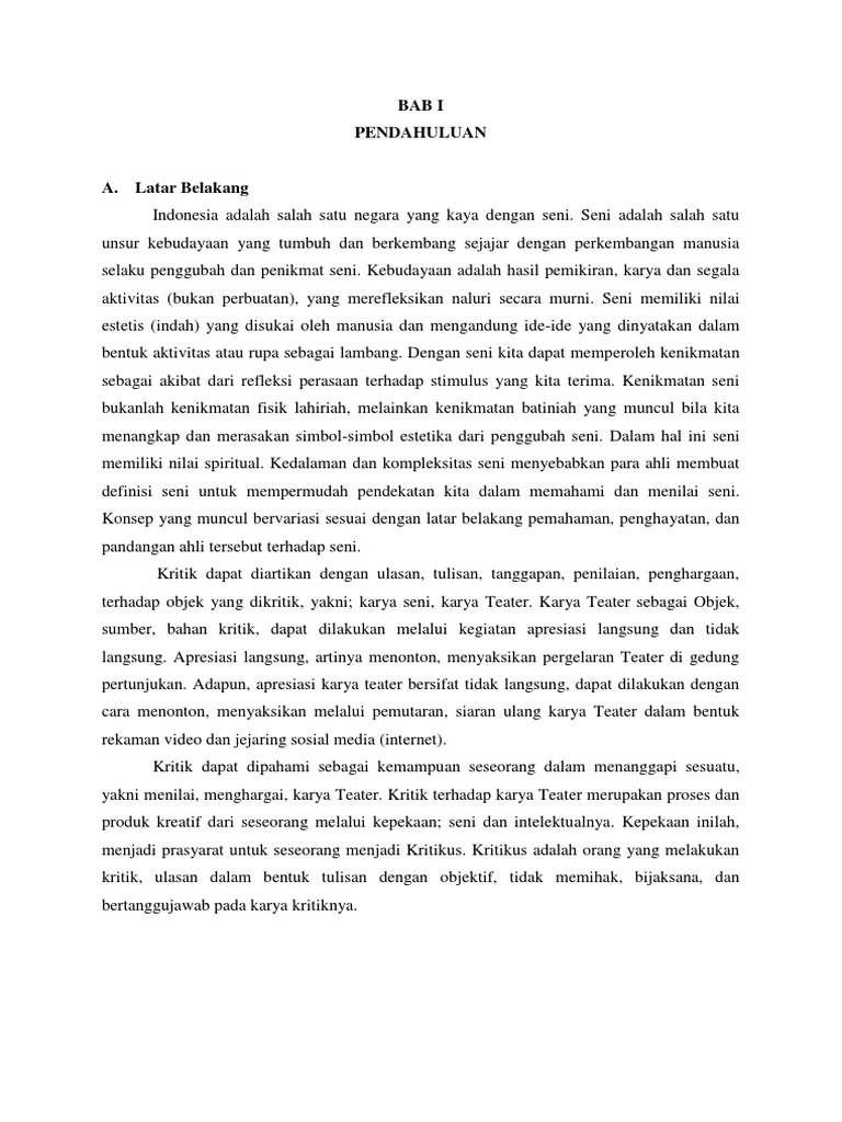 Web Viewsilabus Mata Pelajaran Seni Budaya Seni Teater Wajib Pilihan Aspek Sma Kelas X Doc Document from demo.vdocuments.mx Makalah seni pertunjukan teater tentang seni pertunjukan teater guru pembimbing: Pengertian seni demikian universalnya seni sebagai bagian dari kebudayaan, sehingga wajar jika ada banyak definisi seni yang dikemukakan, diantaranya : Seni adalah ekspresi dari penuangan hasil pengamatan dan pengalaman yang dihubungkan dengan perasaan, aktifitas fisik dan psikologis ke dalam bentuk karya. Bagi seniman kritik tampil sebagai 'cambuk' kreativitas. Dari ke empat bidang ini, sekolah wajib menyelenggarakan dan kalian wajib mengikuti 2 dari 4 bidang seni yang ditawarkan tersebut. Rangkuman seni budaya kelas x bab 16 kritik teater (seni budaya kelas 10 sma/ma/smk/mak) semester 2. Fungsi komunikasi seni dapat digunakan sebagai alat komunikasi seperti, kritik sosial, gagasan, kebijakan dan memperkenalkan produk kepada masyarakat. Kritik terhadap karya teater dapat dilakukan melalui pendekatan pengamatan, evaluasi kritis terhadap beberapa aspek dan fungsi pertunjukan yang dihadirkan di atas pentas.dan unsur utama dalam seni pertunjukan dilengkapi dengan analisis sumber bacaan naskah dan referensi yang akan dijadikan sumber rujukan dalam menulis kritik.